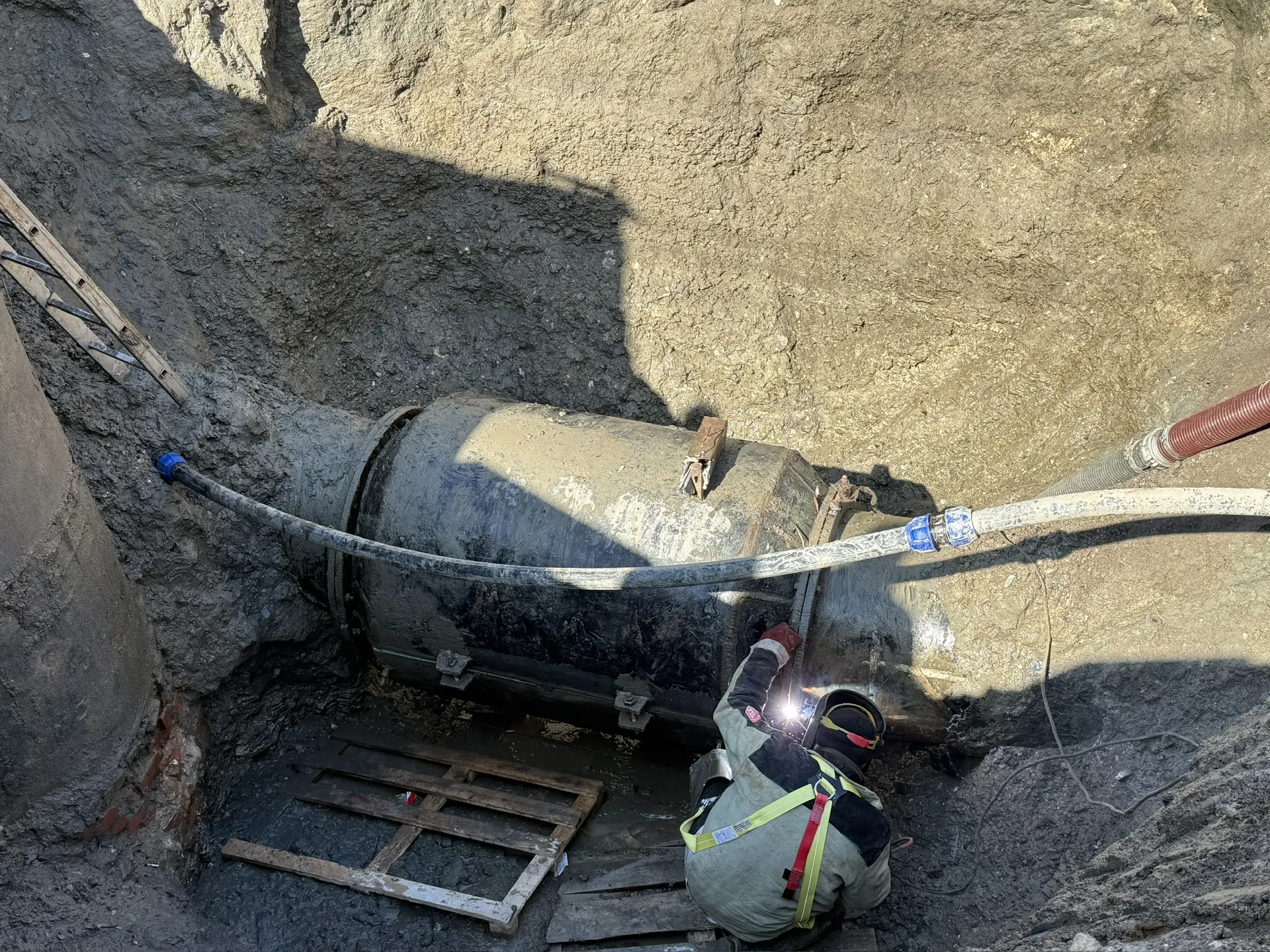 — Наши сварщики сначала с ювелирной точностью довели этот бандаж с диаметра 1200 мм до диаметра трубопровода, чтобы уже потом надеть его на трубу и приварить. На это потребовалось немало времени. Параллельно в месте разрытия мы ежедневно откачивали воду, чтобы она не подтапливала ближайшие дома, — поделился начальник цеха по эксплуатации и ремонту сетей ВКХ «Центр №1» Армен Папоян.